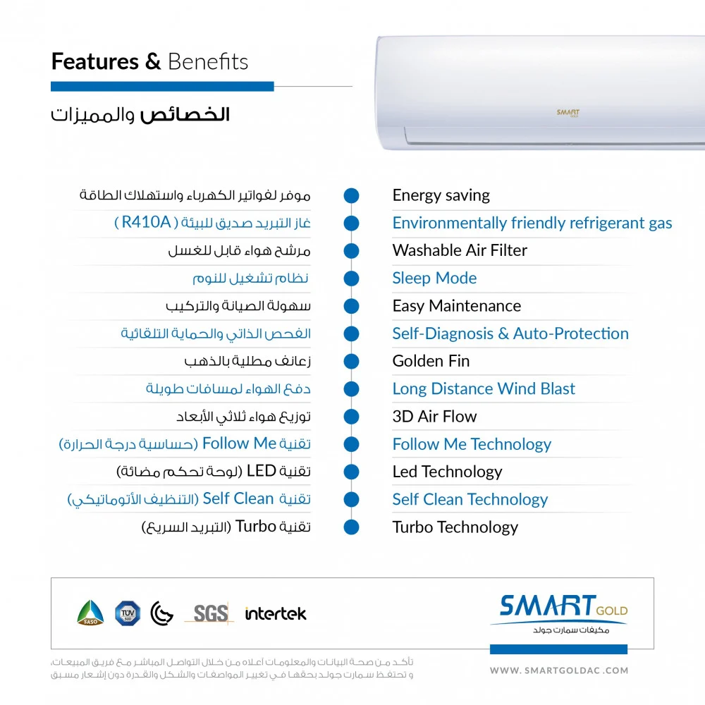 يمتاز المكيف بتصميم سمارت جولد العصري الذي يضفي لمسة جمالية على أي غرفة تركيب الجهاز على الجدار بسيط وسهل مما يجعله مناسبًا لجميع الديكورات الداخلية الحديثة والكلاسيكية على حد سواء تصميم الوحدة الخارجي يعكس جودة عالية ويضيف لمسة فخمة على المكان، ليكون الجهاز ليس فقط وسيلة للتبريد، بل عنصر تصميمي يعزز أناقة الغرفة